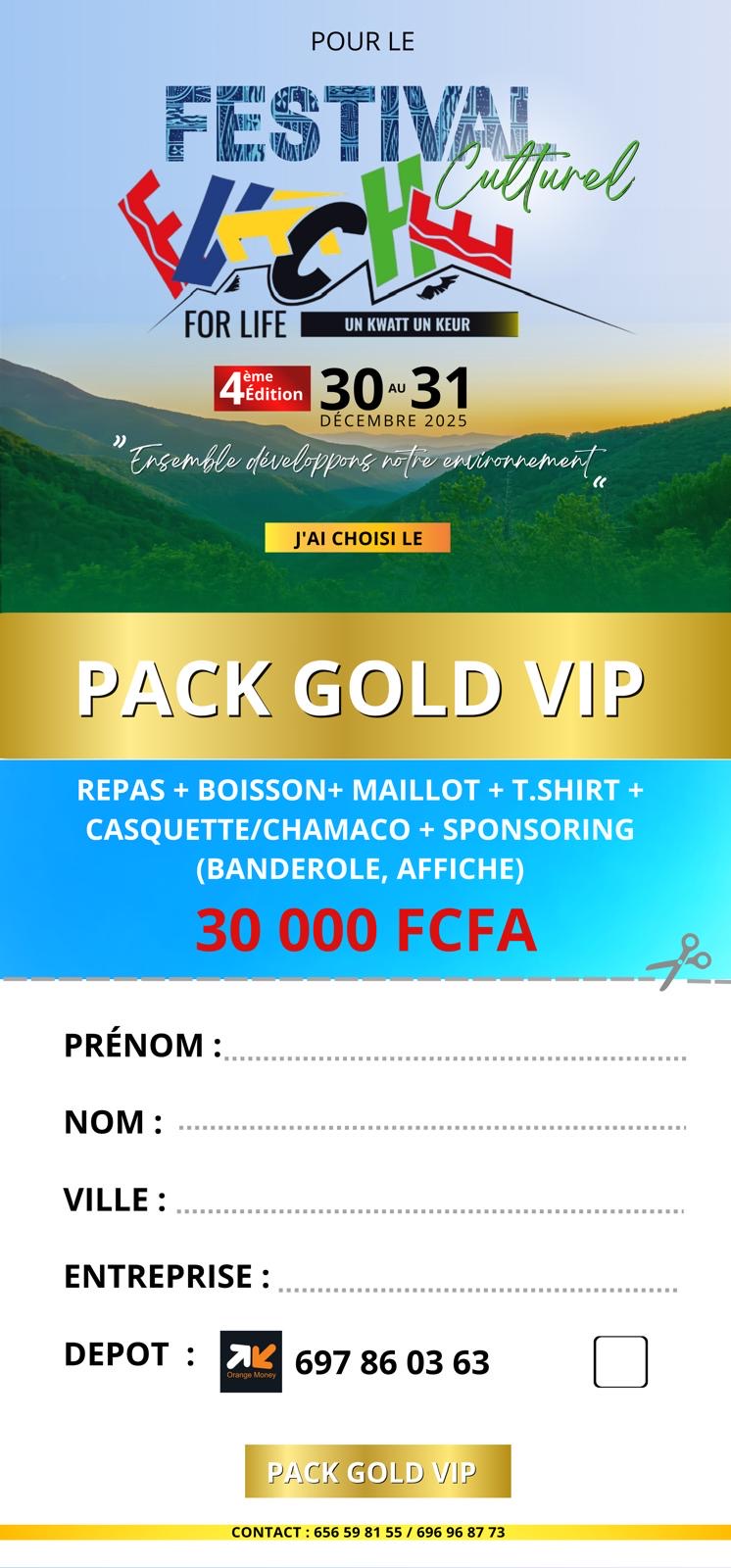 Profitez d’une expérience privilégiée au Festival Culturel Évêché For Life avec le Pack Gold VIP. Pour seulement 30 000 FCFA, bénéficiez d’un pack complet incluant : repas, boisson, maillot, t-shirt, casquette/chamaco, ainsi qu’un sponsoring sur banderoles et affiches. Un choix idéal pour vivre le festival en mode VIP tout en donnant de la visibilité à votre marque.